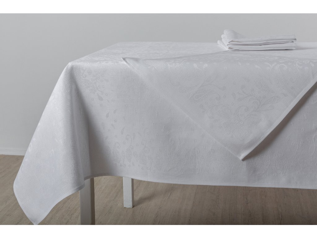 Souprava na stůl s klasickým bílým ubrusem a 6x ubrousky s elegantním vzorem, která krásně doplní interiér Vaší jidelny při slavnostní příležitosti. Tento tkaný ubrus je vyroben z kombinace lnu a bavlny a při správné udržbě vydrží dlouhá léta.
