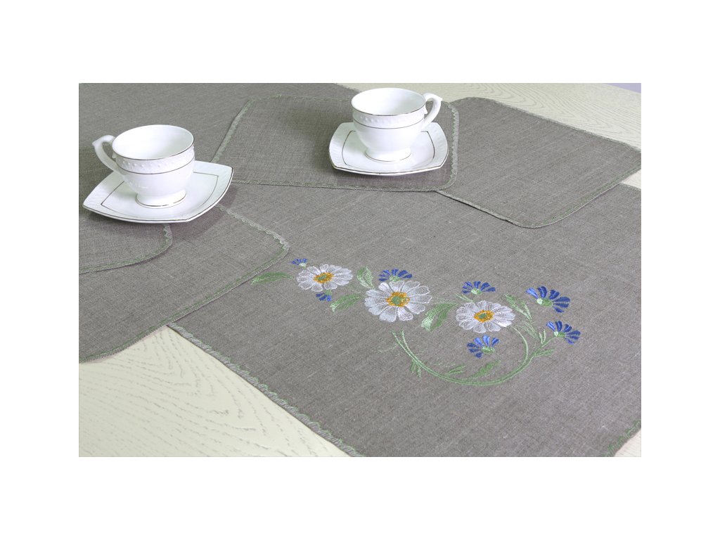 Lněná souprava na stůl v přírodní šedé barvě s vyšitými květinkami. Díky svému výborném složení je vysoce odolná vůči mechanickému poškození a velice trvanlivá.