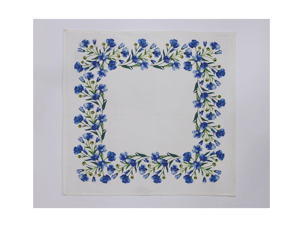 Lněný ubrousek s modrým květinovým potiskem. Ideální pro slavnostní příležitosti nebo pro každodenní použití. Díky svému složení je velice pro udržbu a vydrží Vám dlouhé roky.